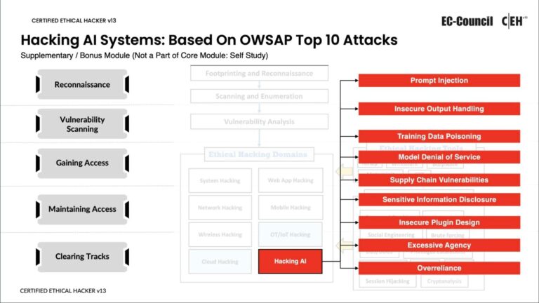 As AI systems are incorporated into corporate processes, hackers are finding them to be attractive targets. A special module on hacking AI systems is included in CEH v13 Ai, which is based on the OWASP Top 10 vulnerabilities specifically designed for AI technology.