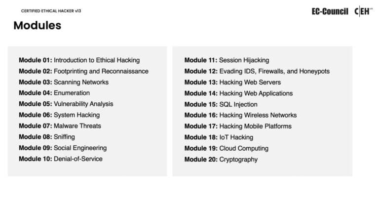 Updated to take into account the most recent advancements in cybersecurity and ethical hacking, CEH v13 Ai consists of 20 modules. These modules cover a wide range of subjects, such as: